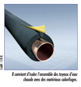 Enfin, de manière générale, il convient d’isoler l’ensemble des tuyaux d’eau chaude avec des matériaux calorifuges. Leur isolation doit être de classe 2, ce qui signifie que l’épaisseur de l’isolant doit être au moins égale à la moitié du diamètre extérieur du tuyau. Ce calorifugeage peut se faire par bandes isolantes enroulées, par des manchons ou des coquilles souples en mousse ou en fibres minérales. Des isolants à base de laine de mouton ou de chanvre, plus écologiques, peuvent également être utilisés. Attention, cependant : dans tous les cas, le matériau doit résister à l’humidité et être appliqué sur des canalisations propres.